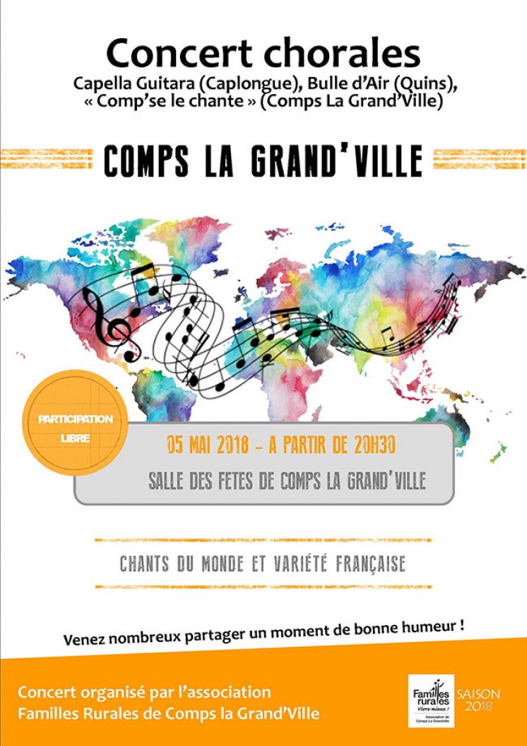 Capella Guitara (Caplongue, Bulle d'air (Quins), Comp'se le chante (Comps Lagrand'ville) vous attendent le 05 Mai à la salle des fêtes