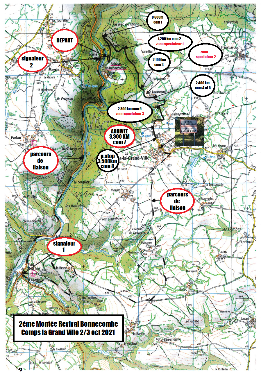 Il s'agit d'une montée en démonstration sans chronométrage de 3,4km partant de l'embranchement de l'Abbaye de Bonnecombe jusqu'à la croix en Pierre à l'entrée de Comps la Grand Ville.