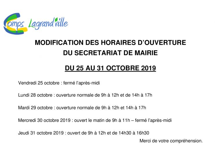 Pour information, les horaires d'ouverture de la mairie sont modifiées comme suit pour la période du 25 au 31 octobre 2019 :