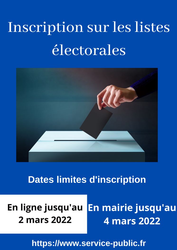 Pour l'élection présidentielle, vous avez jusqu'au mercredi 2 mars 2022 pour le faire en ligne et jusqu'au vendredi 4 mars pour faire la démarche en mairie. Cette inscription est nécessaire pour faire valoir votre droit de vote.